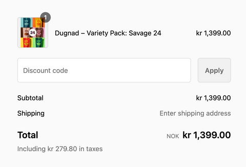 Etter du har plassert din ønskede Variety Pack i nettsidens "Shopping Bag", trykker du på "Check Out". Der vil du finne et område for "discount code". I dette feltet plasserer du inn koden "SubjektPluss_VIP50".